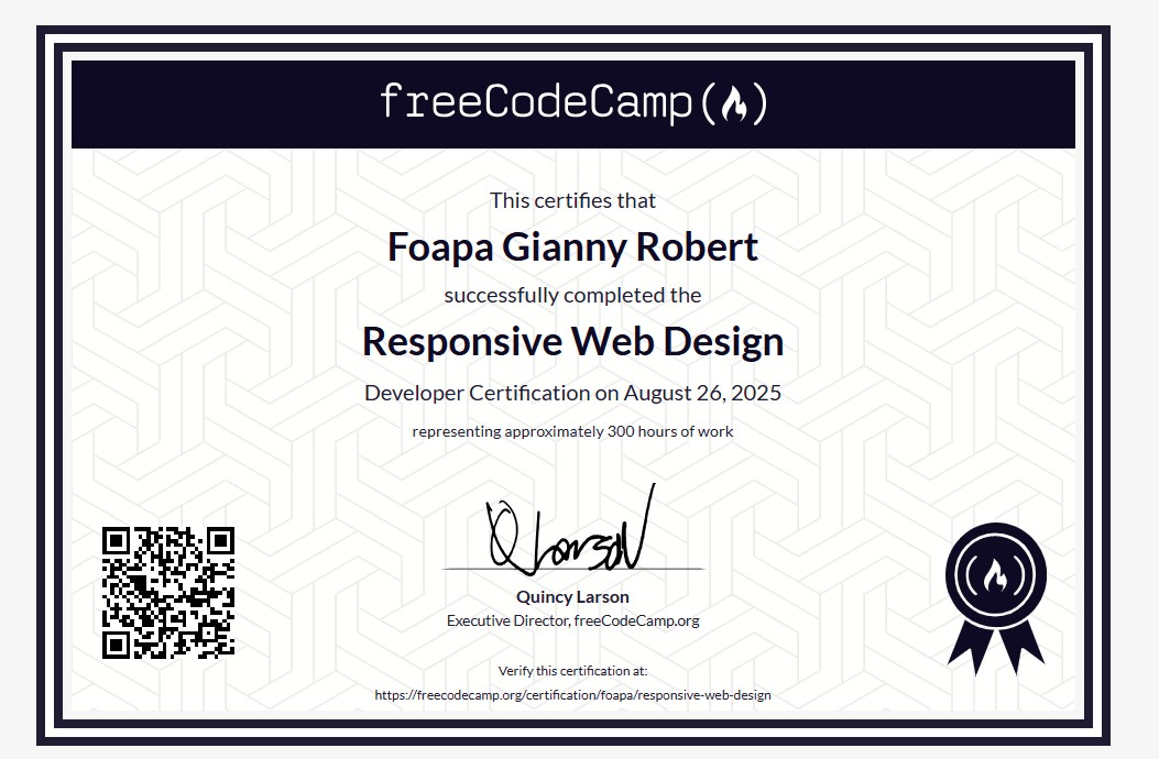 Obtention de la certification en Responsive Web Design avec maîtrise de HTML, CSS, Flexbox et Grid.